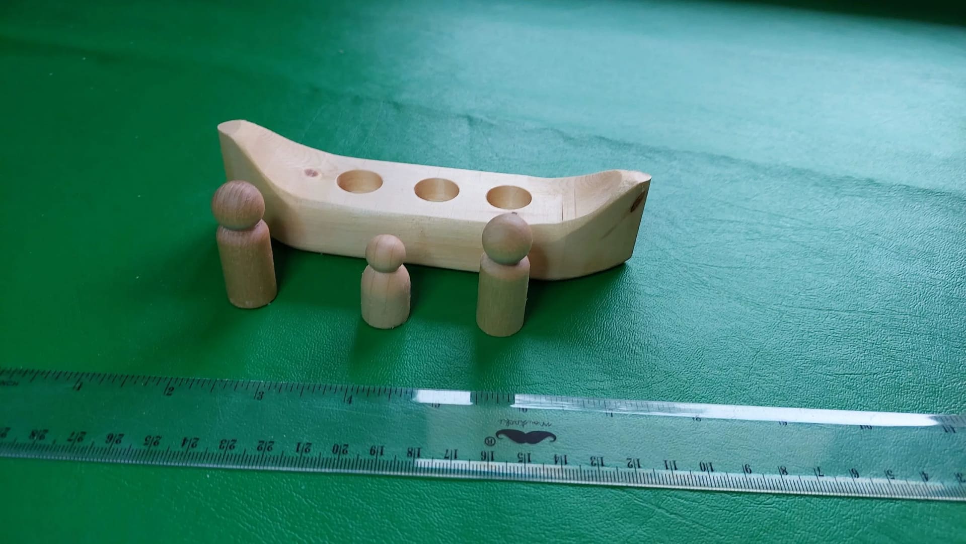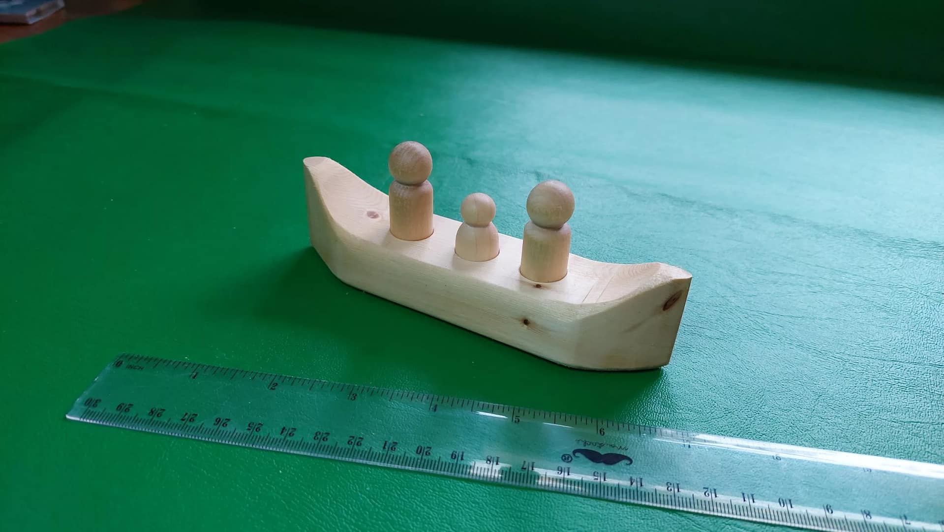 Small canoe with 3 peg people with removable people. Finished with a food safe beeswax finish. Measures 6 inches long by 1 1/2 wide by 3 inches high.