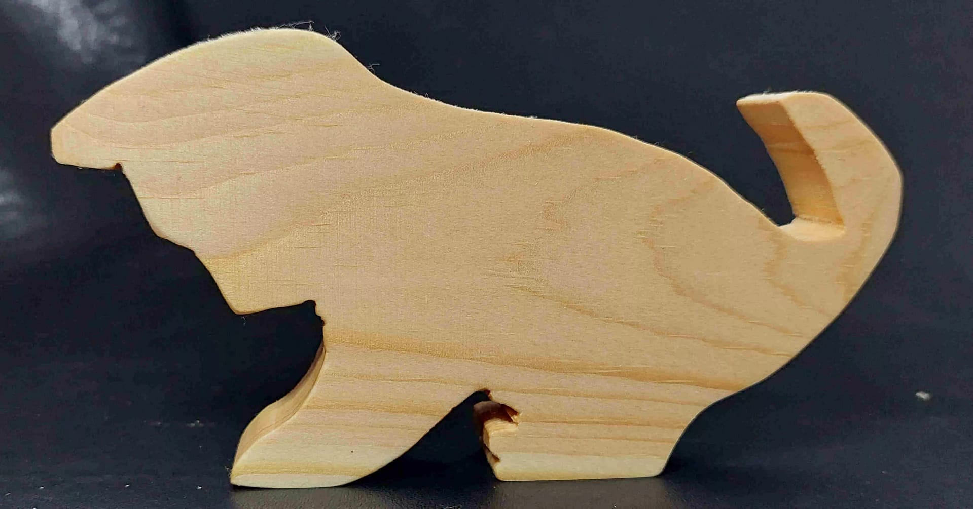 Wooden hand made small cat Curious. Made of pine and coated with a food safe beeswax finish. Size 5.5 inches wide, 3 inches tall .75 inches deep.