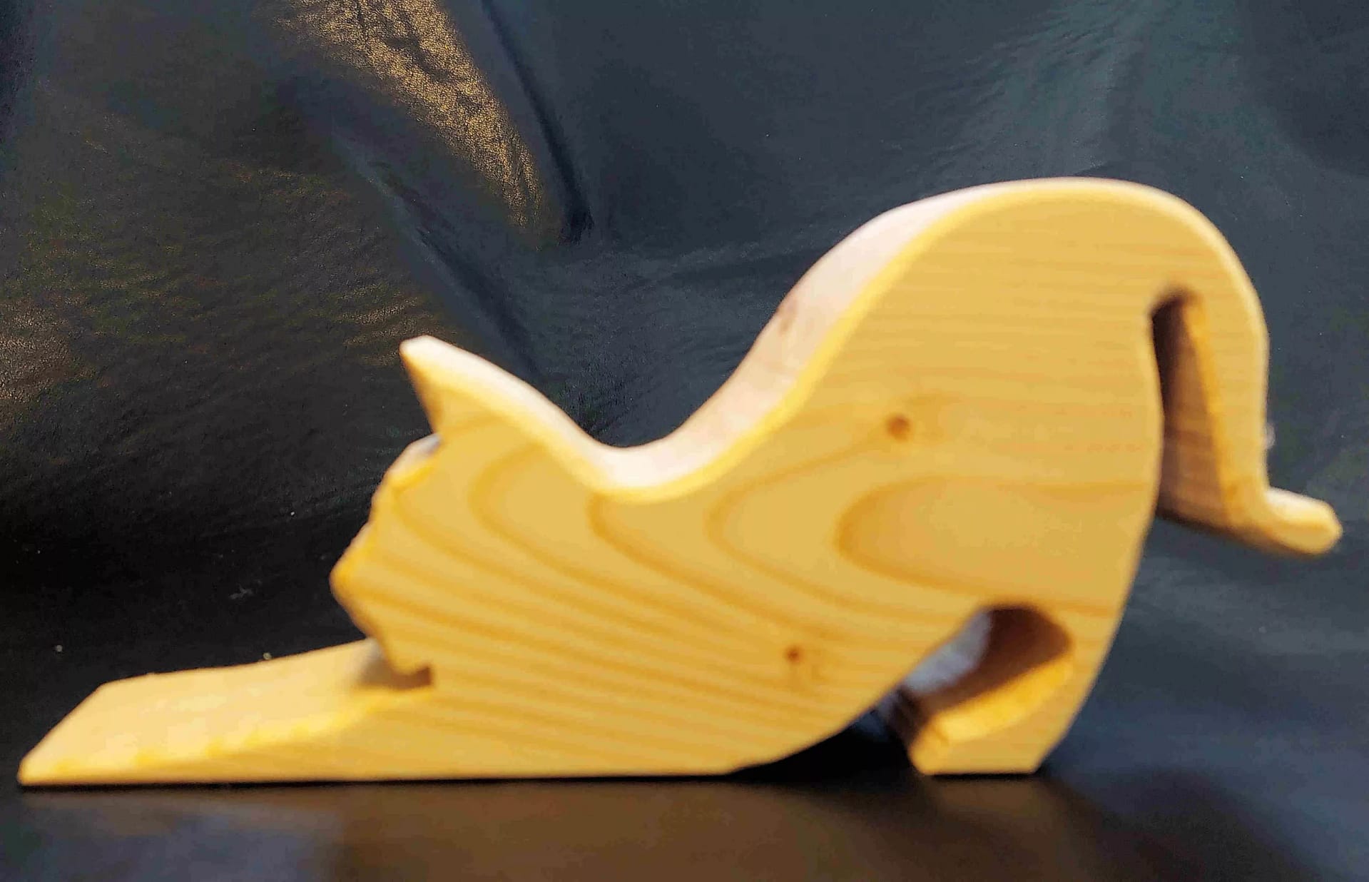 Wooden hand made Cat Stretching Door Stop – Large. Made of pine and coated with a food safe beeswax finish. Size 7 inches wide, 2.5 inches tall .75 inches deep. This cat can be used as a door stop to keep doors from closing.