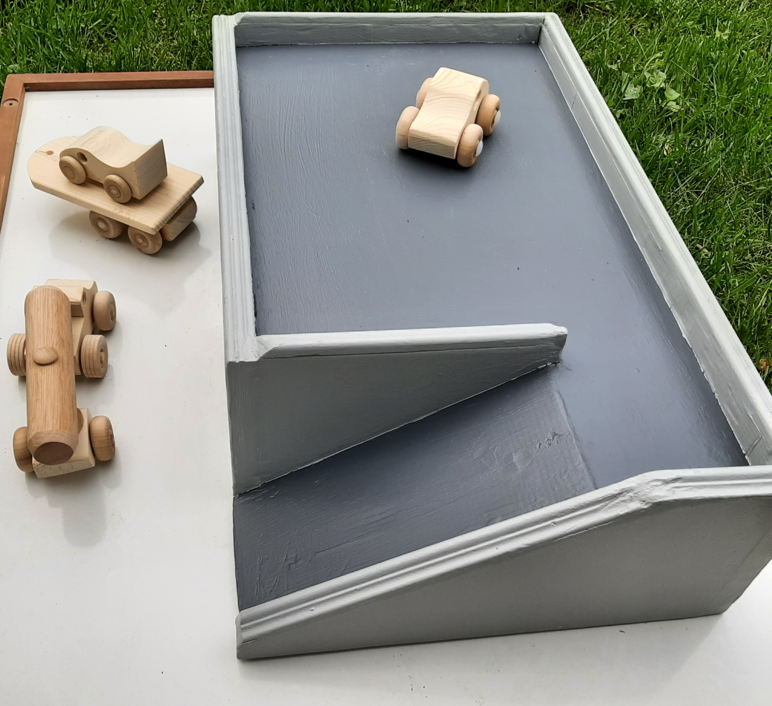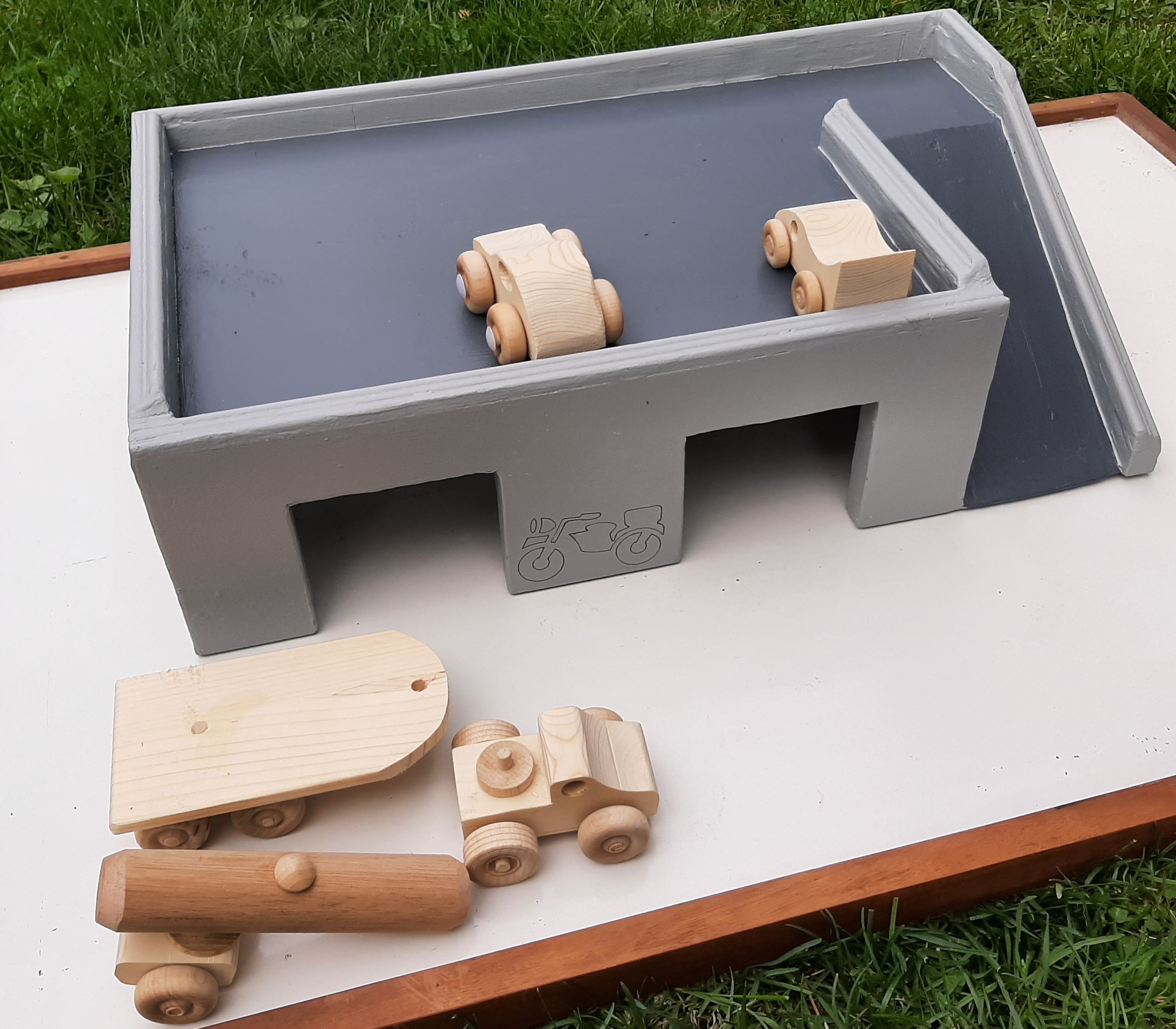 Local hand made toy garage made of wood. Solid lots of play value. $25.
