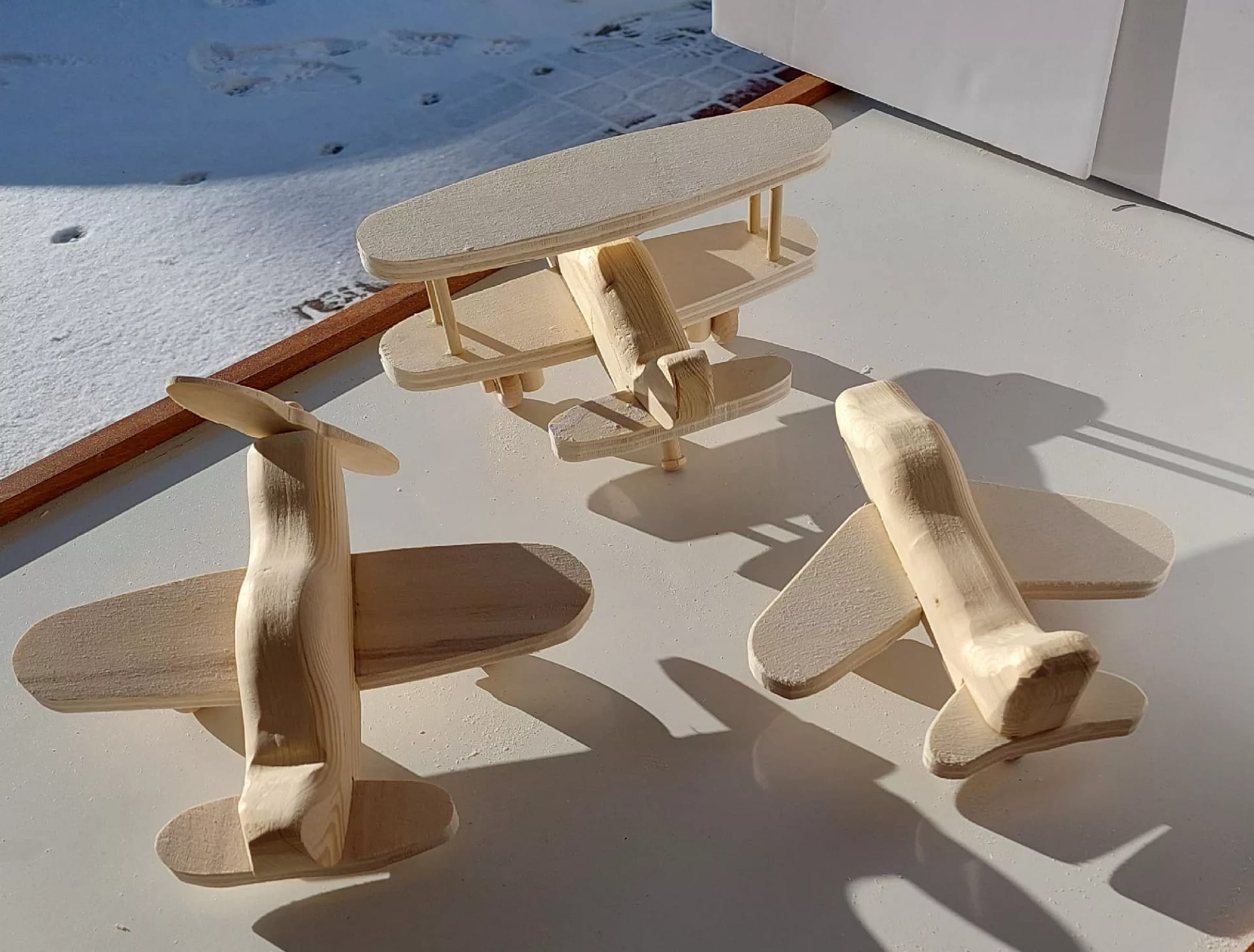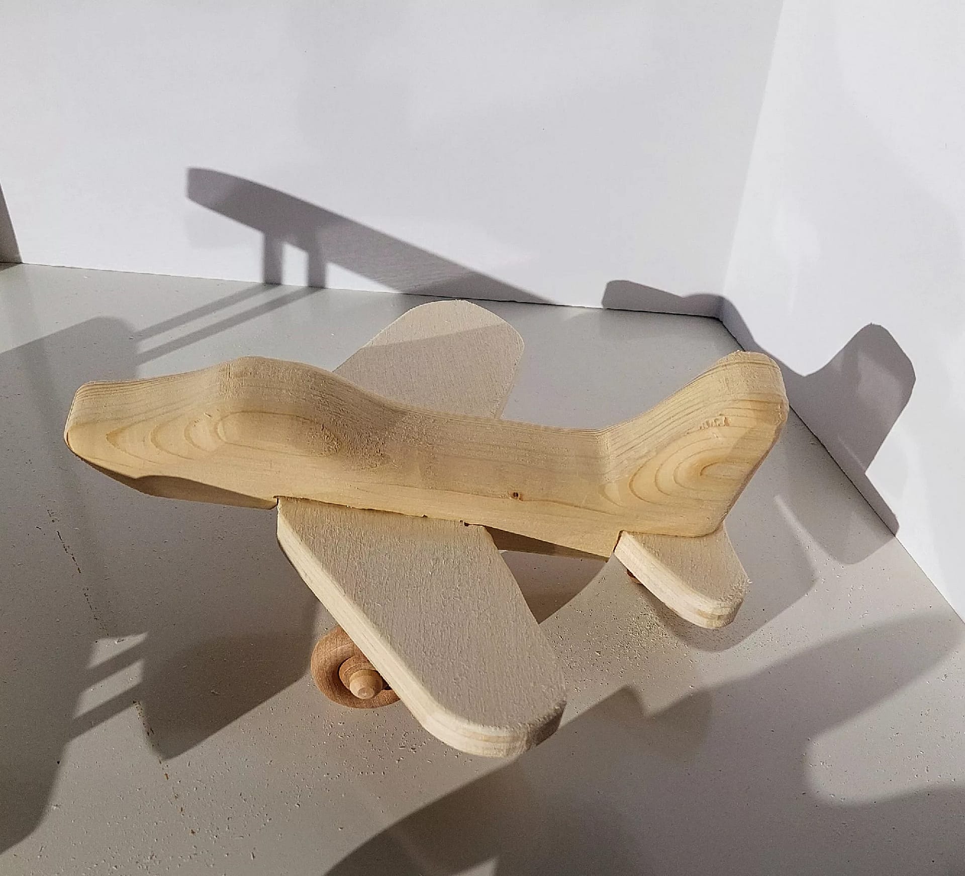 Large jet plane measures 8 inches long, 7 inches wide and 4 inches high. Made of unfinished pine.