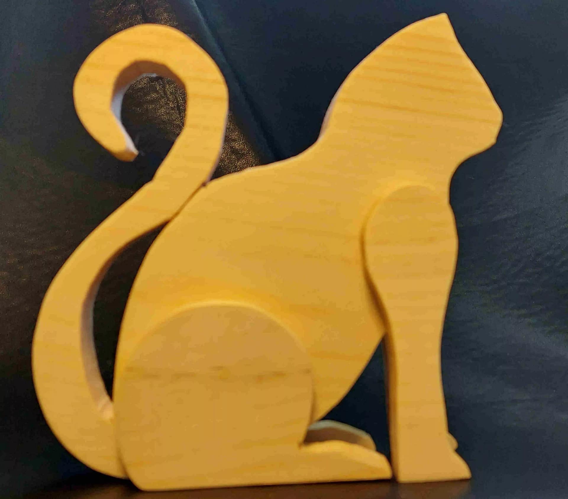 Wooden hand made sitting Kitten/cat large. Made of pine and coated with a food safe beeswax finish. Size 5.5 inches wide, 6 inches tall 1.5 inches deep.