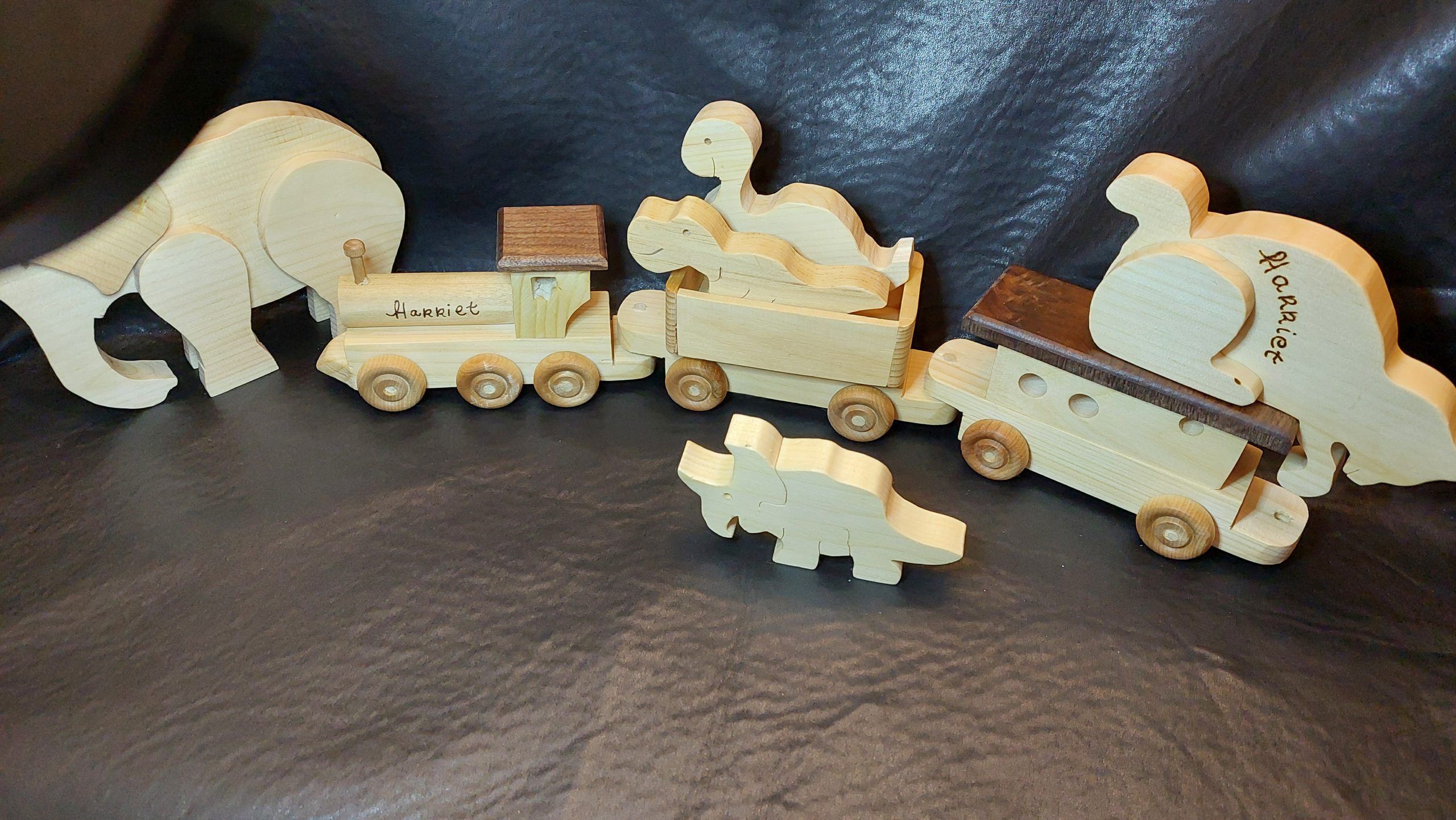 This train is designed to look like an old steam train with an animal transport wagon. Animals include either 3 Zoo animals or 3 Dinosaurs. If you would like different animals please make a request and we will try to accomodate your request. It comes with a steam engine and caboose. Length is about 24 inches long.