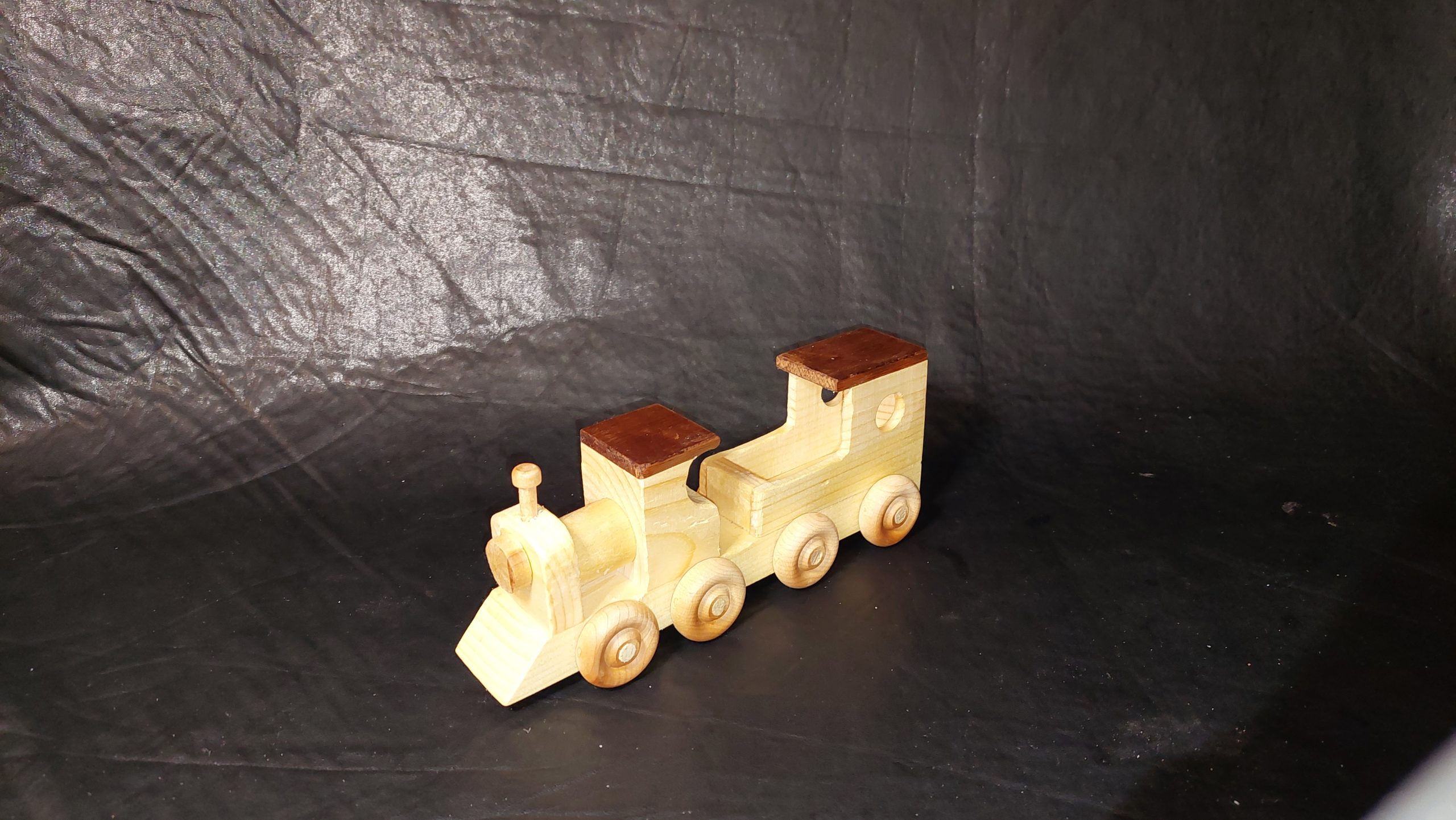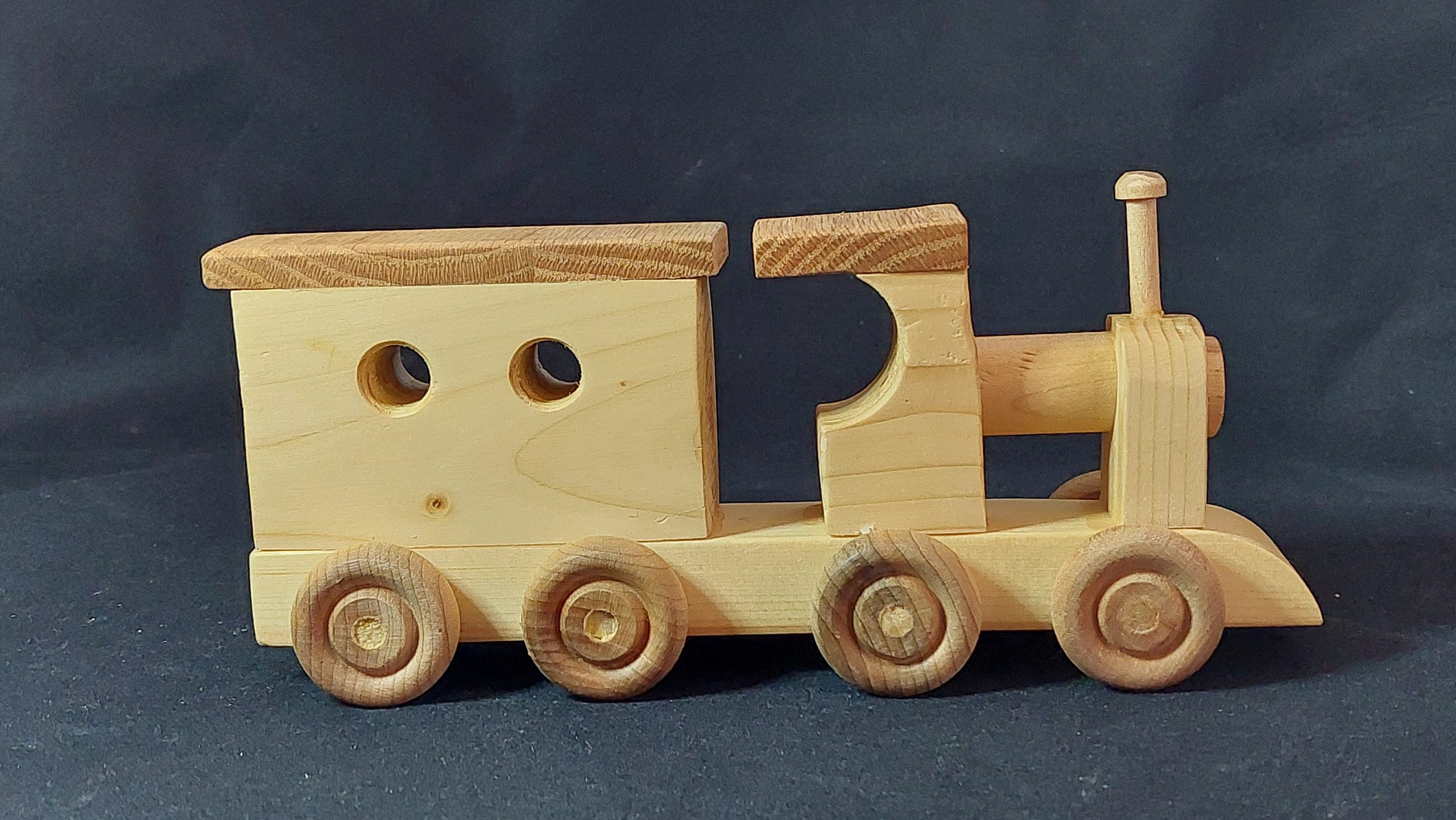 This is a medium sized train but in one piece includes engine and pasenger car, the new design is an Engine, coal car and caboose on the same platform. The coal car allows for small objects to be transported.