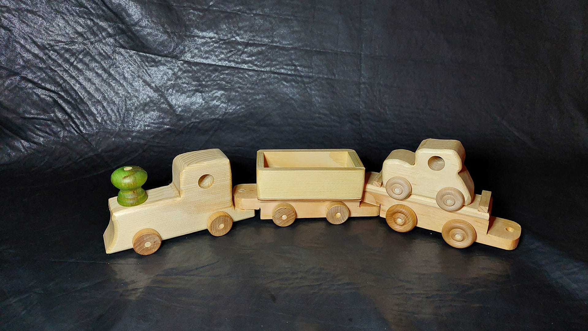 Train with Locomotive, Flat car with a small car and freight car. Style of engine will vary depending on availability. If you prefer a specific style please contact us. Locally hand crafted 4 piece wooden toy train, Made in unfinished pine, hand sanded, and coated with a food safe beeswax. Train measures about 17 in long, 3.5 in wide and 3 in high. Engine and flat car measures each about 6.5 in long, freight car is 5.5 in. and the flat car measures 3.5 by 3 by 2.5 inches.